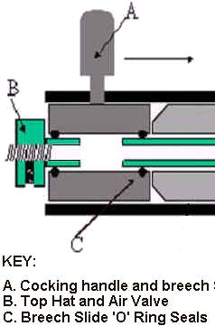 The Breech on the stealth and Talon rifles is sealed by means of a simple plastic cylindrical slide which is fitted with two rubber 'O' rings which are mounted in internally machined grooves and a cocking handle, as shown. In use, the slide bridges the gap, which forms the loading port when open, between the rearmost end of the barrel and the Air valve Top Hat. The rubber 'O' rings serve to prevent the escape of high pressure air during the firing cycle Because of their exposure to dust and the relatively high degree of movement with which they have to contend in service, the 'O' rings should be kept lubricated with a suitable silicone-based grease, and cleaned regularly. Naturally, the 'O' rings wear with use and the first symptom of this is a noisier than usual report on firing, as high pressure air audibly escapes past the seals. The only cure is to replace the 'O' rings and, fortunately, this is a simple job to carry out. The following pages describe how to remove the Air Bottle Securing Collar, Remove the Breech Slide and replace the 'O' Ring Seals.